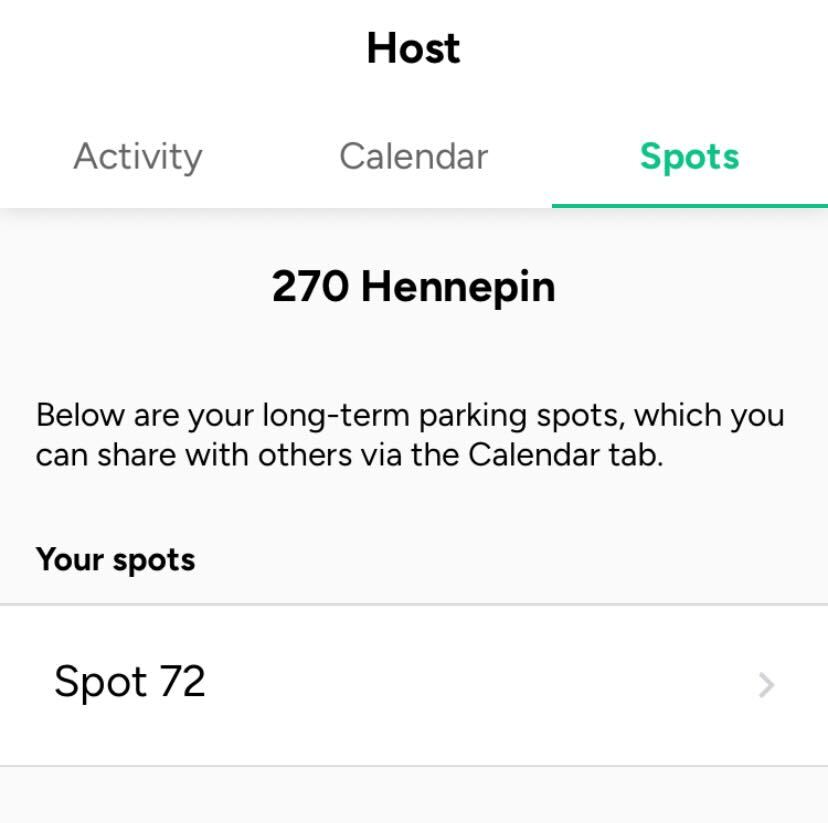 Tap on the Host tab at the bottom of the Parkade app, then tap Spots to see all the spots you can rent to others. Note that spaces you sublease from others cannot be made available to others to rent.